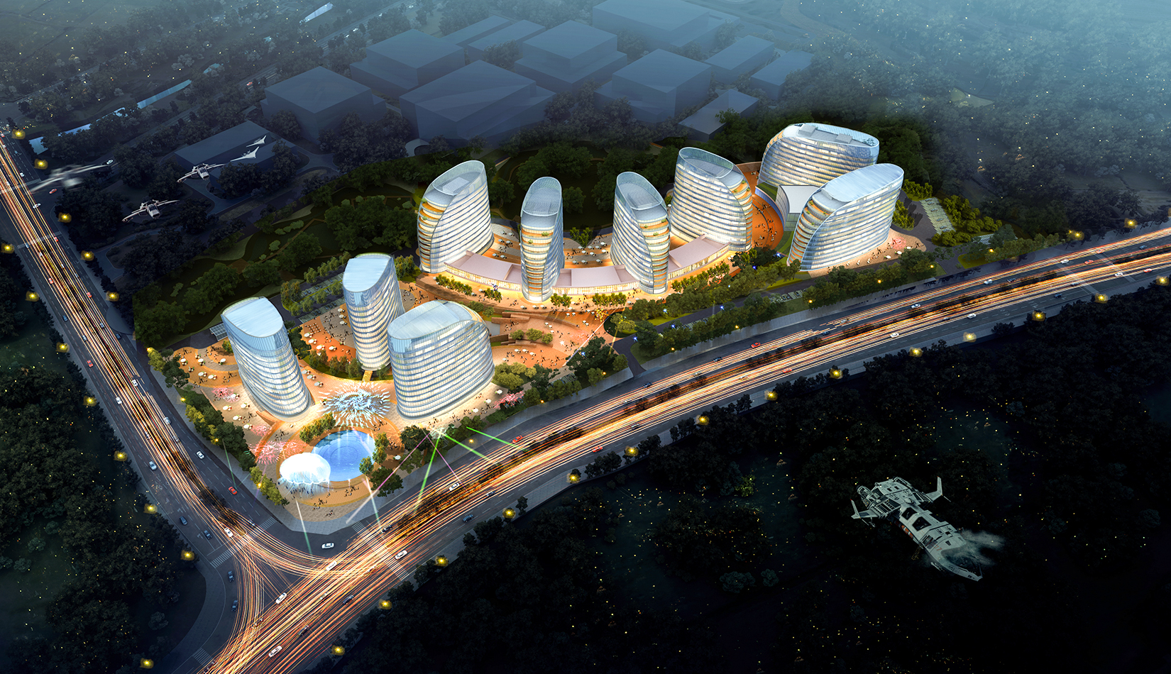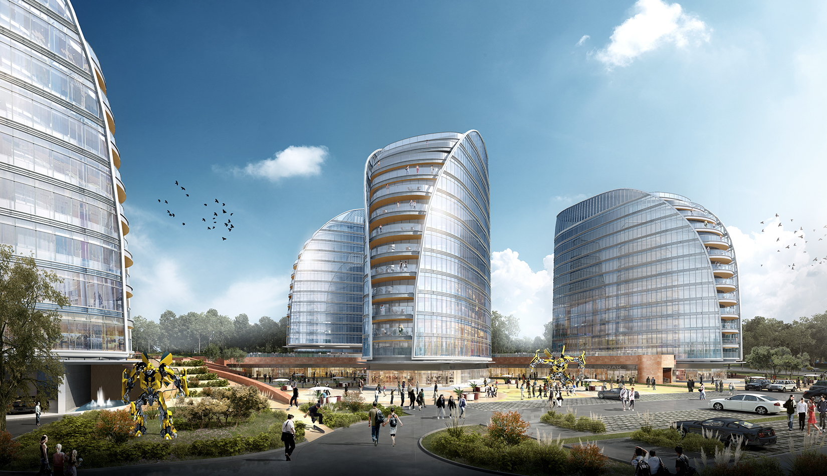 注重地塊內空間環(huán)境的滲透和景觀視線效果,保持地塊環(huán)境與城市環(huán)境的共融性,提升城市空間價值。建筑外觀采用簡潔、現代的風格,立面形象富有視覺沖擊力,樹立企業(yè)品牌與形象。高層建筑層層平臺向景觀蔓延,為人們提供豐富多變的生活工作空間。底層平臺上的文化內街,結合影視特色主題,聚集人氣,串聯互動。曲線連廊內部空間流動,成為具有活力的公共交往場所。