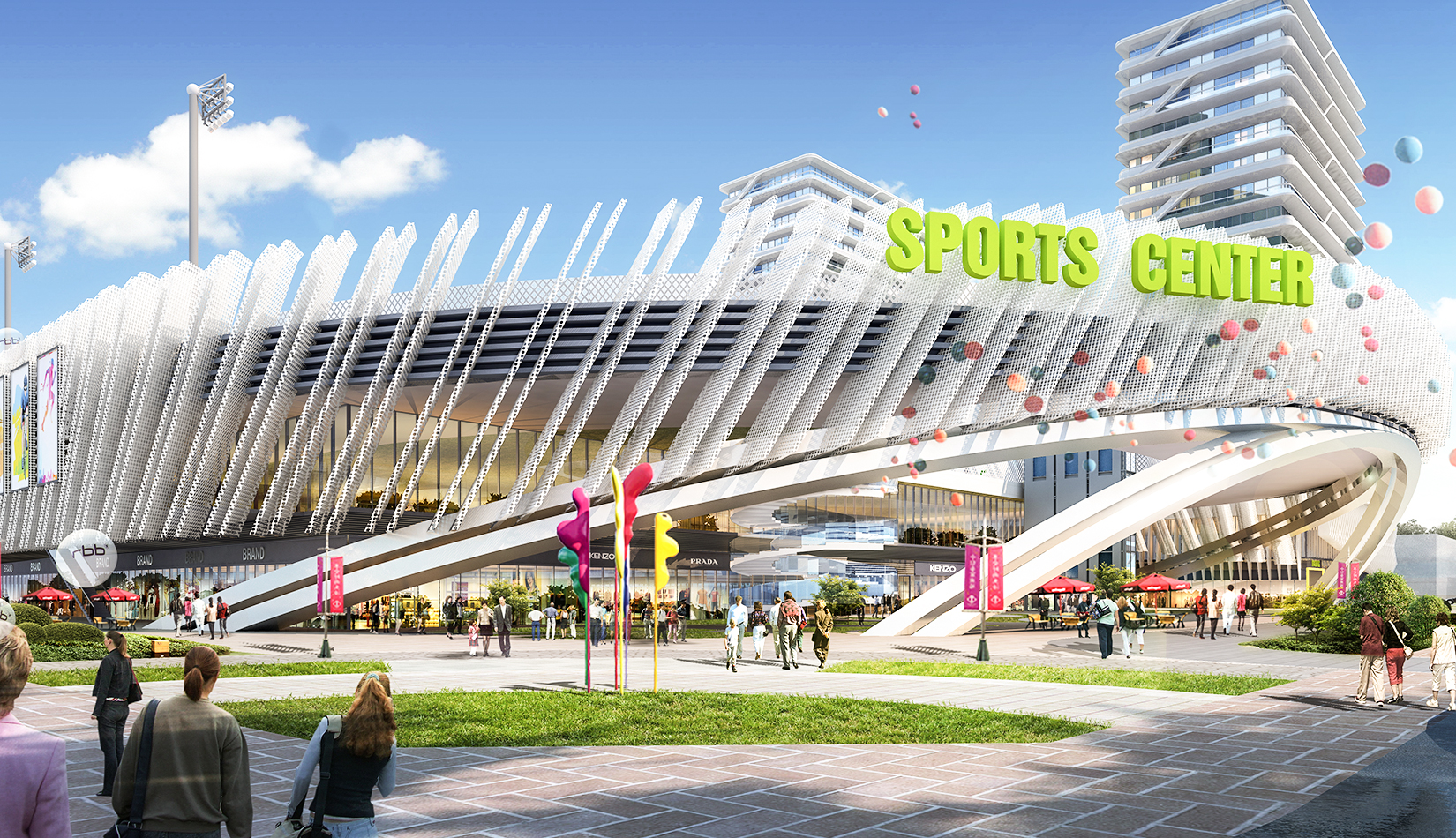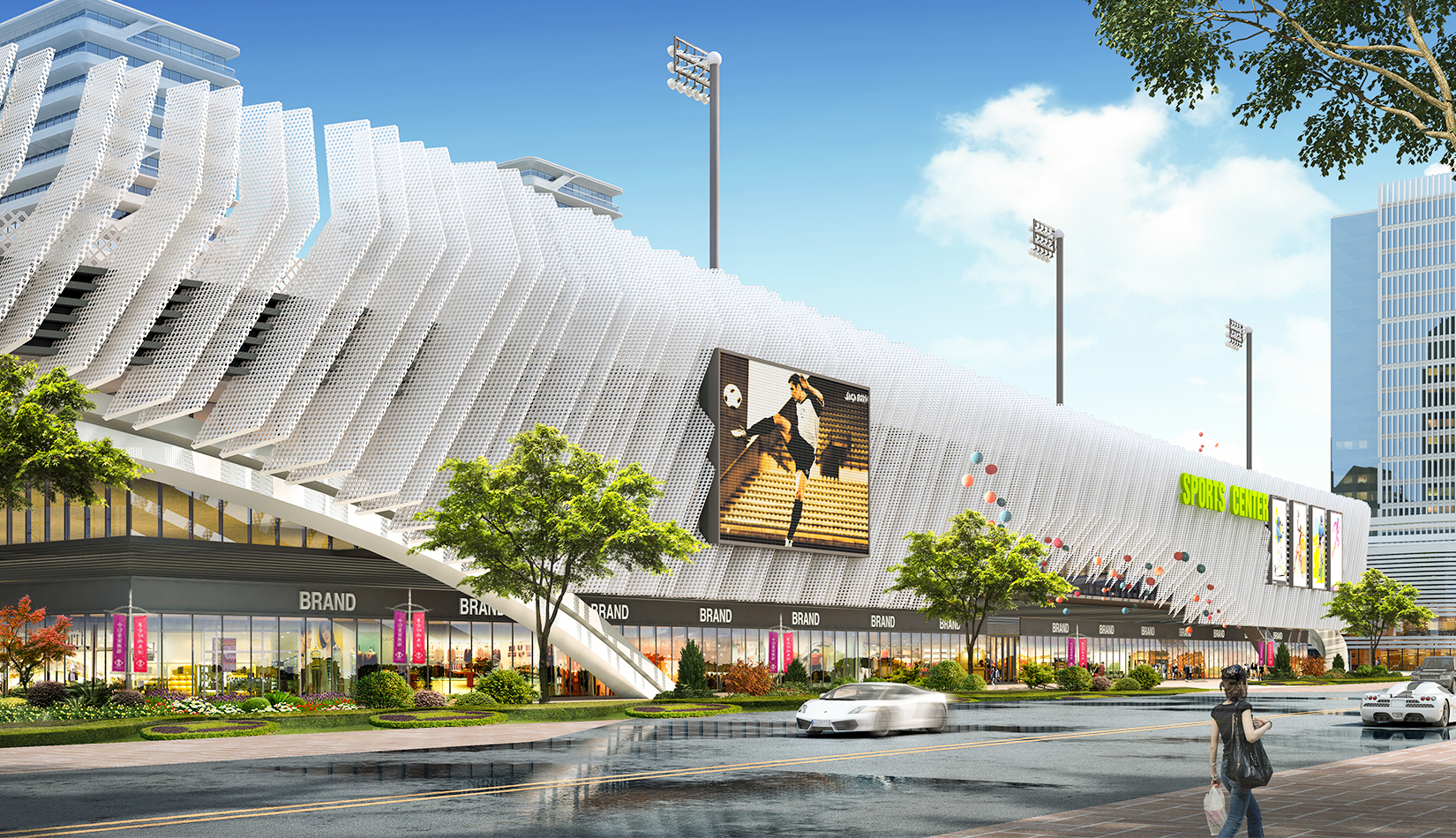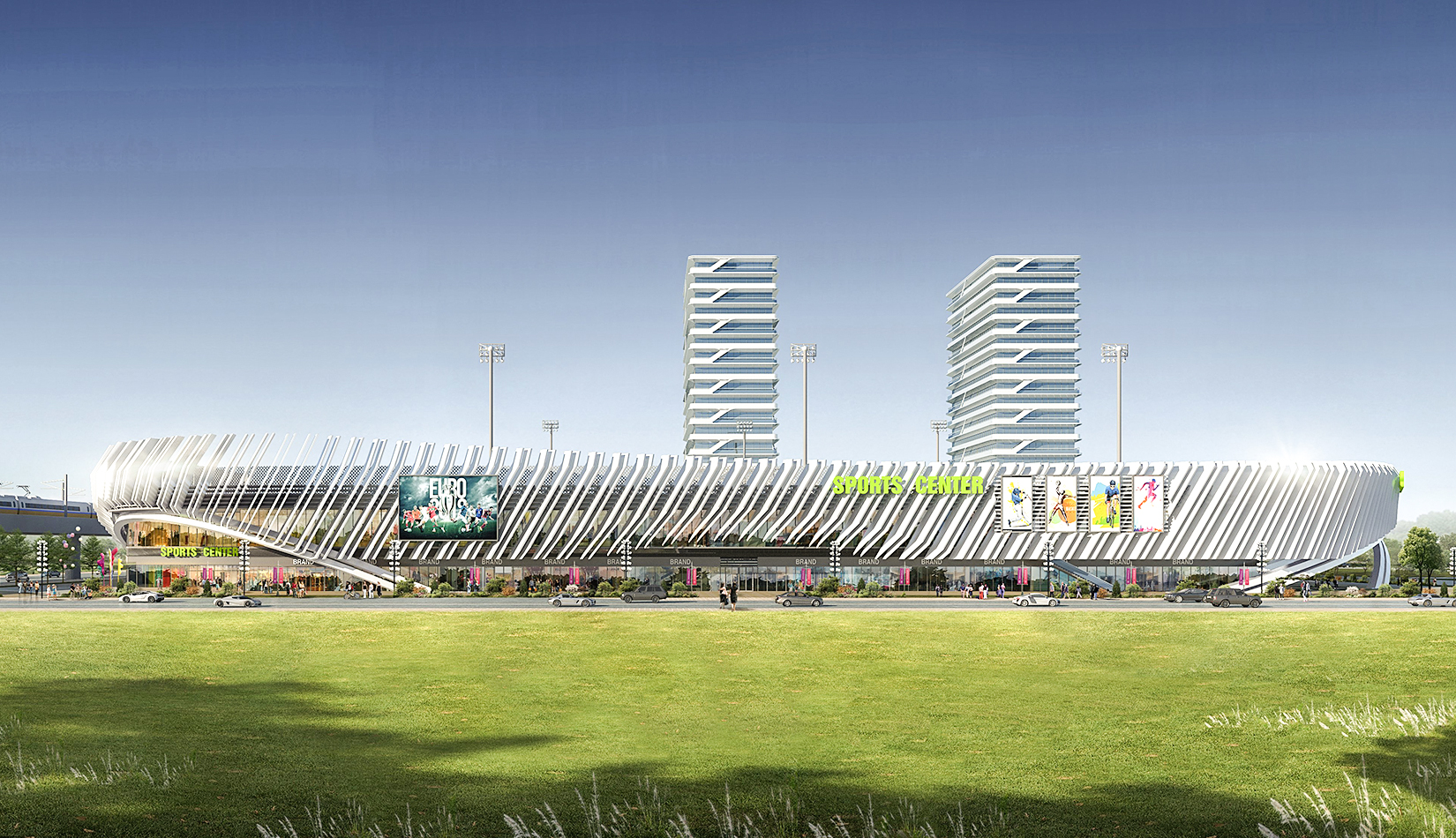 本項目提取高鐵動車和海浪浪花的概念,用白色鋁板陣列與變化塑造出體育綜合體泛著浪花的海洋波浪造型。同時利用動車動感流線的造型設(shè)計出公寓的整體方案。海浪與動車流線結(jié)合,不僅代表了青島的特色,更是詮釋了積極動感的體育精神。將景觀引入建筑,以景觀打造形象,形成未來綜合體發(fā)展模式。