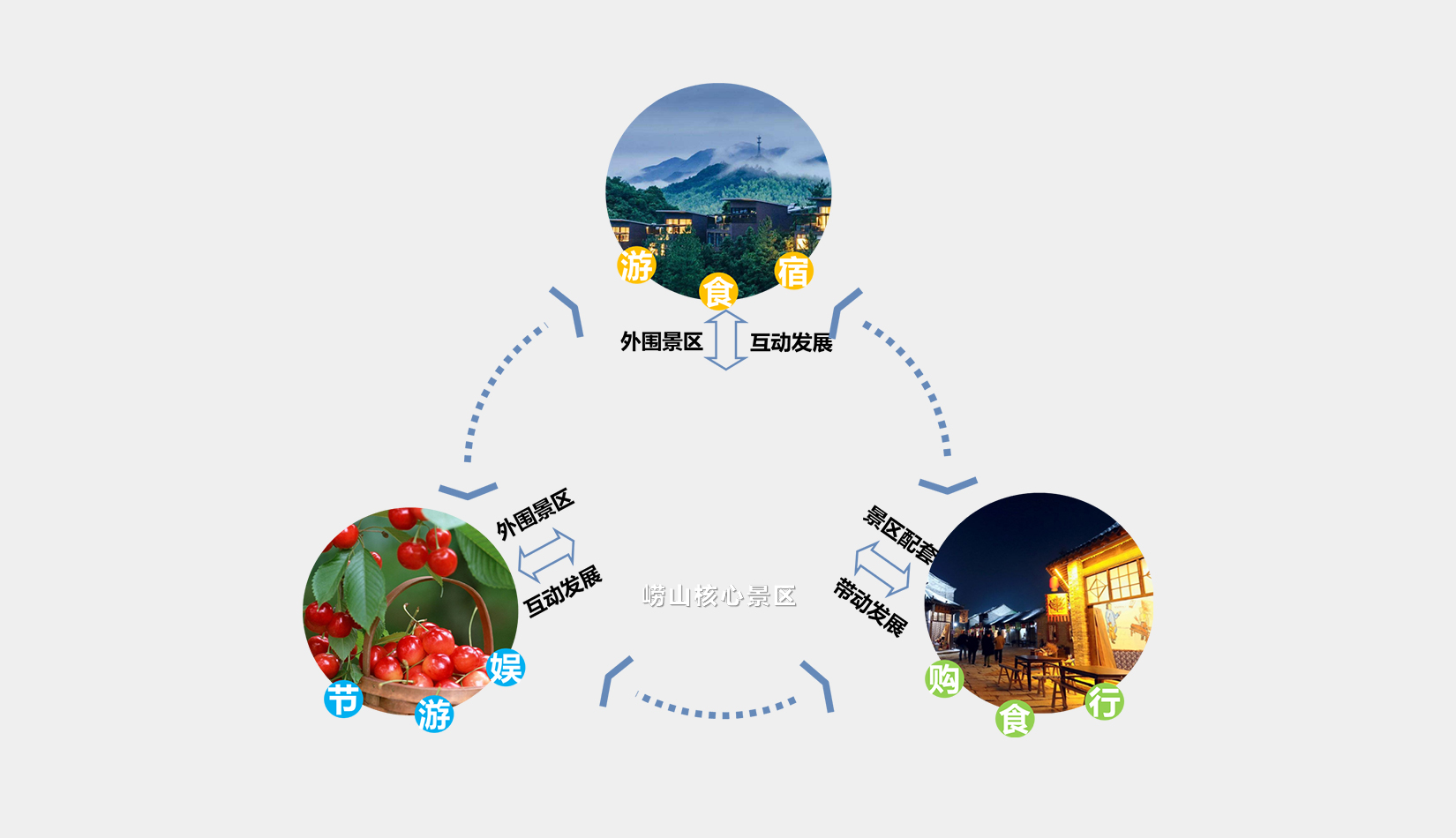 項目規(guī)劃目標:在國土空間規(guī)劃、生態(tài)修復城市修補背景下,重新定義村莊發(fā)展格局;依托嶗山風景區(qū)旅游品牌、聲譽、影響力,培育村莊獨特的旅游景點、活動項目,吸引外圍景區(qū)游覽客群;在旅游游線、服務設施、活動項目等方面,充分與嶗山主景區(qū)互動,打造分工明確、各有側重、各俱特色的旅游服務村落集群。