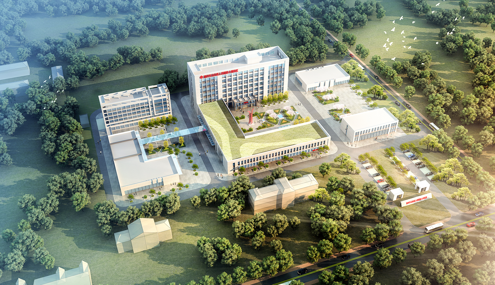 景觀設(shè)計(jì)采用圍合、穿插、滲透等設(shè)計(jì)手法,營造公園式景觀綠化,與建筑群體融合呼應(yīng),打造一個(gè)會呼吸多元化的綠色醫(yī)院,利用建筑之間的圍合關(guān)系,創(chuàng)造動態(tài)的具有生命力的局部景觀。