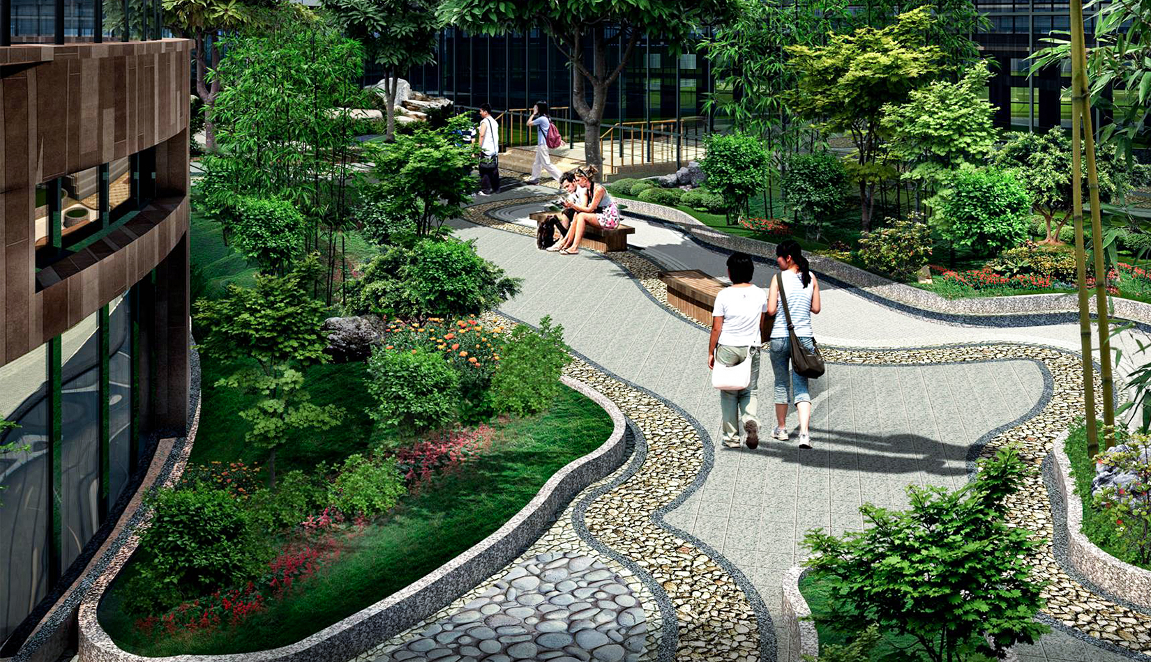 2. 綜合服務樓中心設計特色水景一處,潺潺的流水聲,增加整個入口空間的活潑歡快的氣氛。