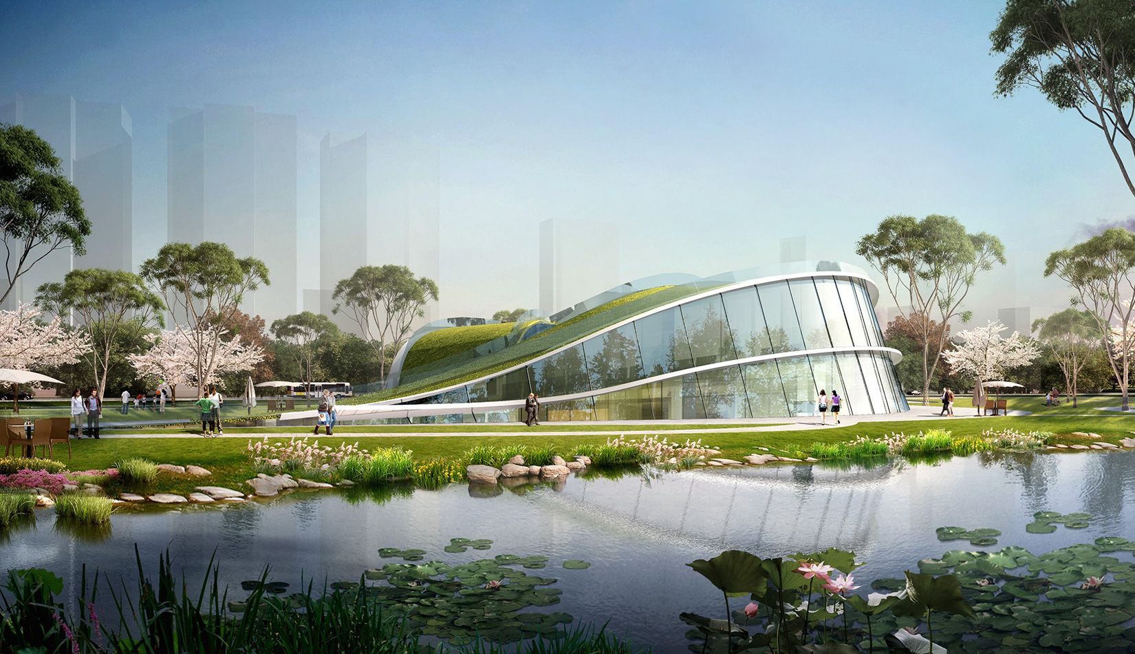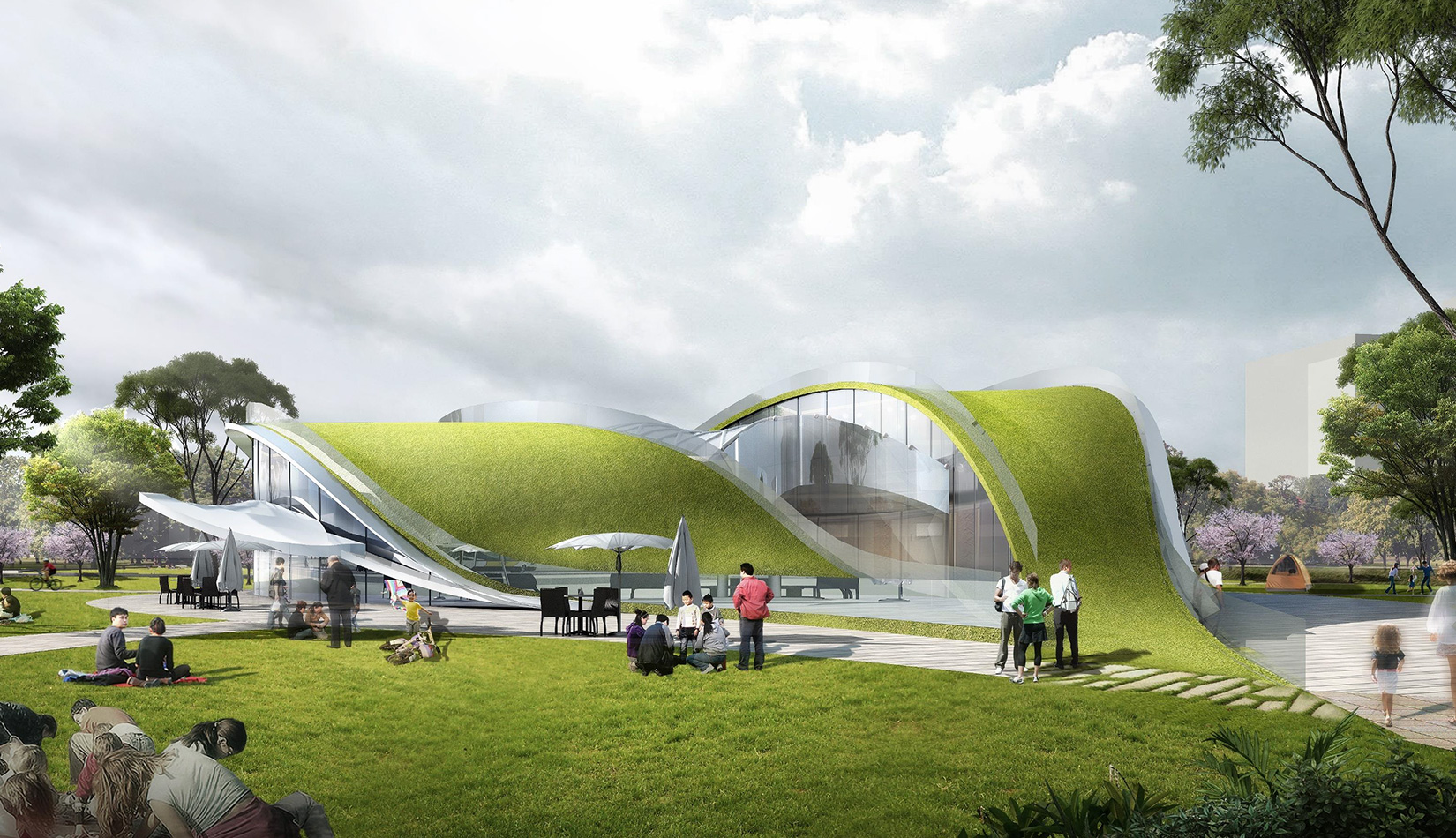 該項(xiàng)目基地位于濱河公園內(nèi),目標(biāo)要將博物館打造成一個(gè)生態(tài)建筑,建筑能與環(huán)境有機(jī)融合。在這一理念下,將博物館設(shè)計(jì)為樹葉形,建筑猶如一片樹葉飄落在公園內(nèi),以此體現(xiàn)建筑與環(huán)境的融合。將樹葉形建筑設(shè)計(jì)為覆土建筑,最大程度還原基地一片綠色,以此呼應(yīng)李村大集的“還原”內(nèi)涵。通過設(shè)計(jì)兩個(gè)曲線形體相互交融形成建筑的最終體量,以此體現(xiàn)相逢意蘊(yùn),呼應(yīng)李村大集的“相逢”內(nèi)涵。