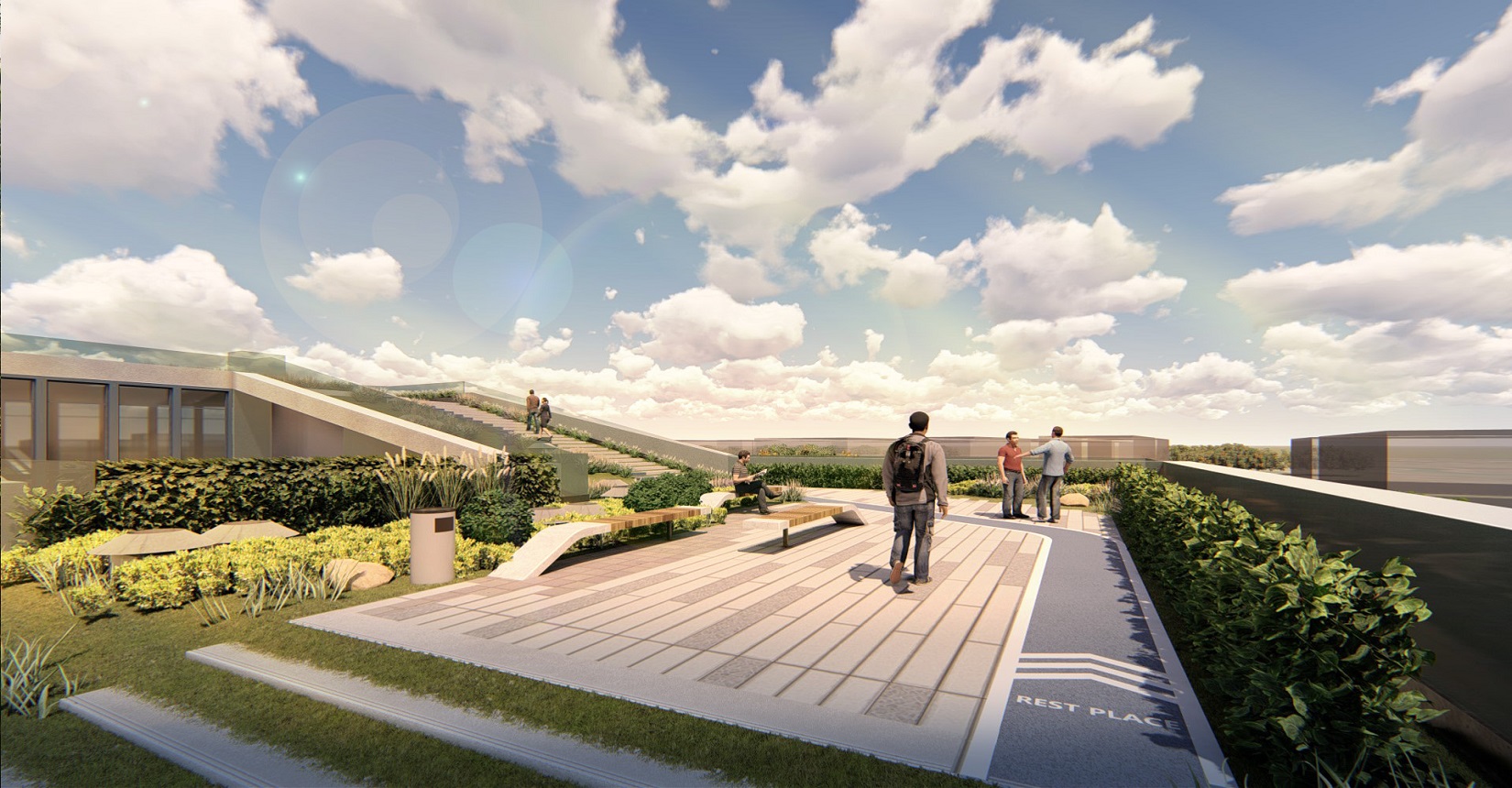 強調(diào)室內(nèi)空間和室外空間的融合,利用屋面打造慢行系統(tǒng),使建筑成為公園的組成部分,將公園景觀引入建筑當(dāng)中,打造具有標(biāo)志性的城市客廳、一個戶外生態(tài)客廳、原生態(tài)的生活空間,鼓勵面對面的交流,員工之間的交流,員工與客戶的交流,鄰里之間的交流。使用一條流動的能量線環(huán)形慢跑道,串聯(lián)整個空間傳達(dá)先進、高能量與流動的整體形象。